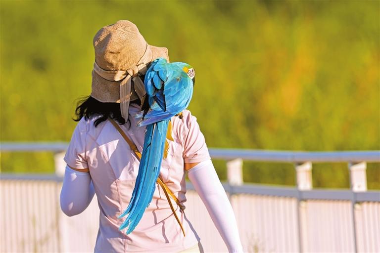▲深圳市民在野外遛蓝黄金刚鹦鹉。 深圳晚报记者 李晶川 摄