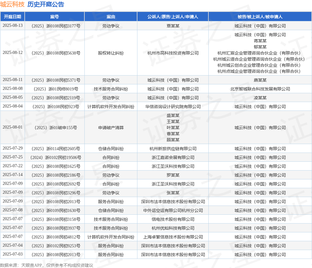 案号:(2025)浙0108民初5638号审理法院:杭州市滨江区人民法院案由:股权转让纠纷当事人信息: 原告/上诉人:杭州市高科技投资有限公司 被告/被上诉人:城云科技(中国)有限公司、蒋某某、郁某某、杭州汇宸企业管理咨询合伙企业(有限合伙)、杭州城云道合企业管理咨询合伙企业(有限合伙)、杭州城云创合企业管理合伙企业(有限合伙)、杭州点城企业管理咨询合伙企业(有限合伙)开庭日期:2025年8月12日根据统计,近一年内以城云科技(中国)有限公司为当事人的历史开庭公告有99则,其中案由为“劳动争议”的公告以39则居首,其次为“合同纠纷”有23则,“服务合同纠纷”有9则。历史开庭公告(前20条)如下: