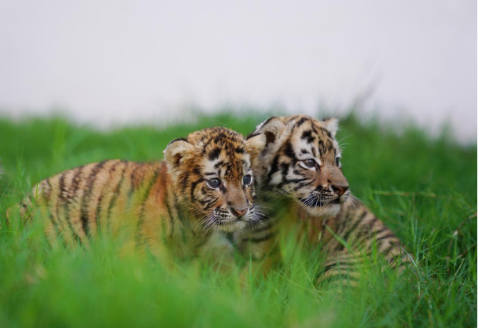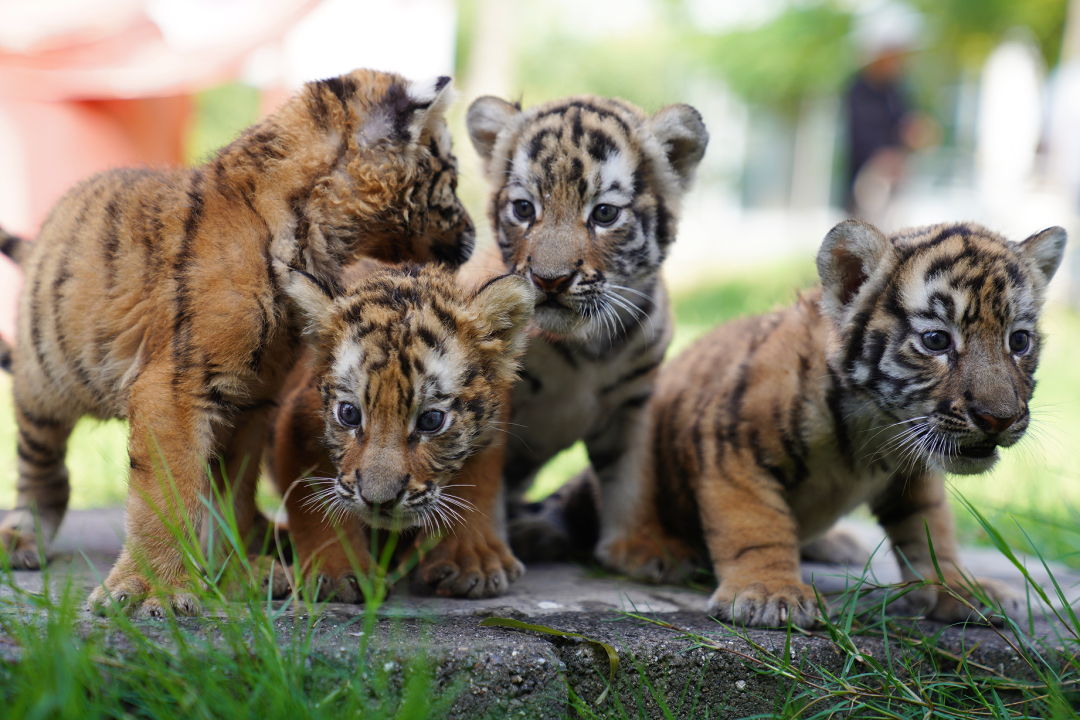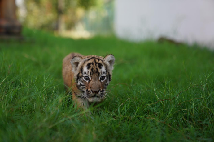 除了珍贵的白狮宝宝,五只虎头虎脑的满月东北虎宝宝,也十分惹眼,只见它们身上棕褐色绒毛,黑色条纹已隐约可见,它们有的在草丛里“潜伏”,用湛蓝色的眼睛好奇地打量着四周;有的嬉戏打闹,发出“啊呜”的怒吼;还有的在草丛里惬意地散步。看到饲养员拿来食物,它们便一股脑涌上去,你一口我一口,吃得不亦乐乎。