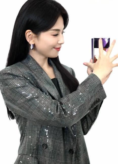 镜头前的刘涛,身穿灰色格子西装,细碎的亮片在灯光下闪着微光。